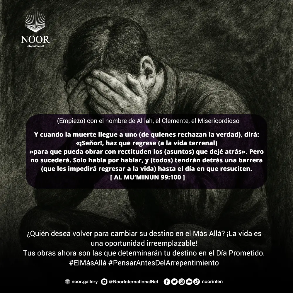 {Y cuando la muerte llegue a uno (de quienes rechazan la verdad), dirá: «¡Señor!, haz que regrese (a la vida terrenal) para que pueda obrar con rectitud en los (asuntos) que dejé atrás». Pero no sucederá. Solo habla por hablar, y (todos) tendrán detrás una barrera (que les impedirá regresar a la vida) hasta el día en que resuciten} [Corán 23:99-100]