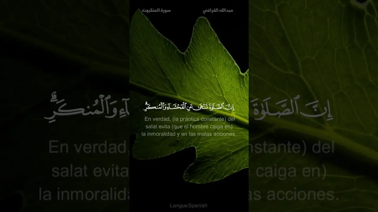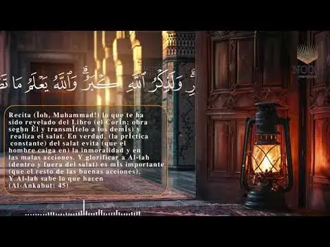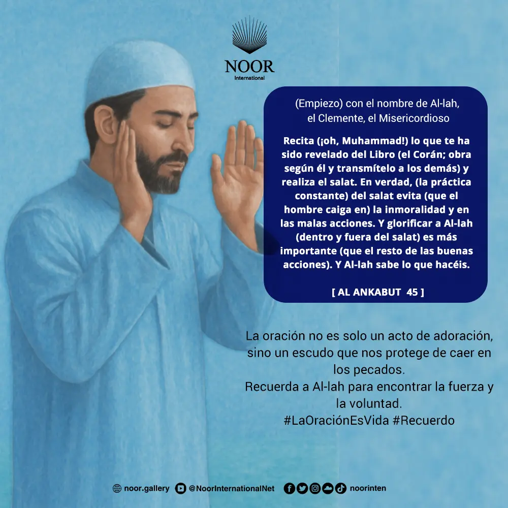 {Recita (¡oh, Muhammad!) lo que te ha sido revelado del Libro (el Corán; obra según él y transmítelo a los demás) y realiza el salat. En verdad, (la práctica constante) del salat evita (que el hombre caiga en) la inmoralidad y en las malas acciones. Y glorificar a Al-lah (dentro y fuera del salat) es más importante (que el resto de las buenas acciones)…} [Corán 29:45]