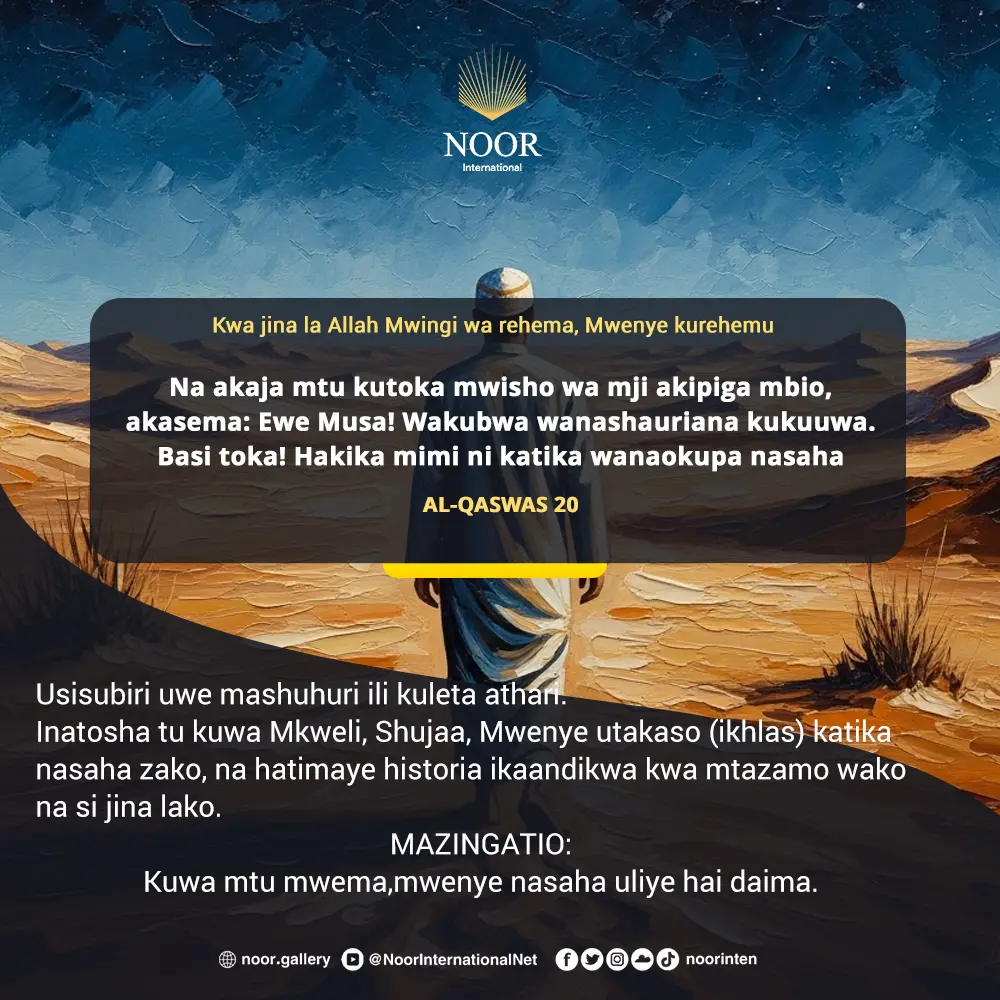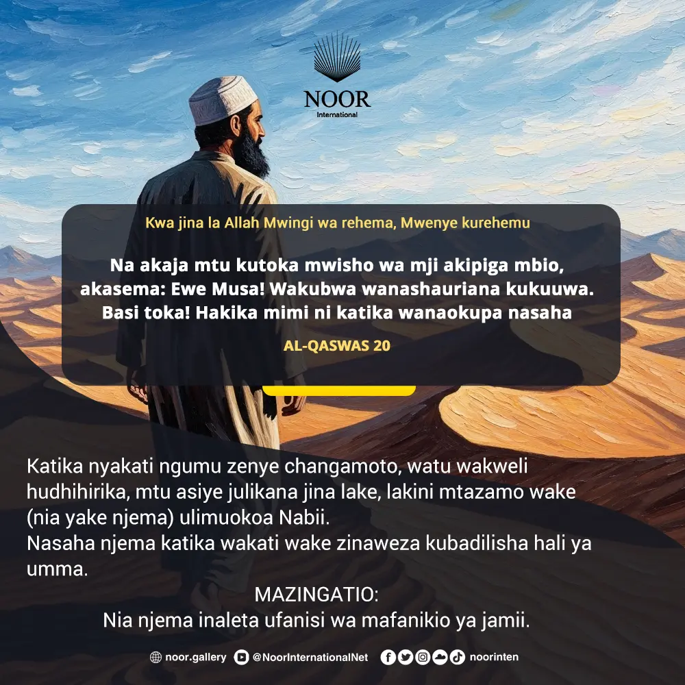 “Na akaja mtu kutoka mwisho wa mji akipiga mbio, akasema: Ewe Musa! Wakubwa wanashauriana kukuuwa. Basi toka! Hakika mimi ni katika wanao kupa nasaha”. Surat Al-Qasas: 20.