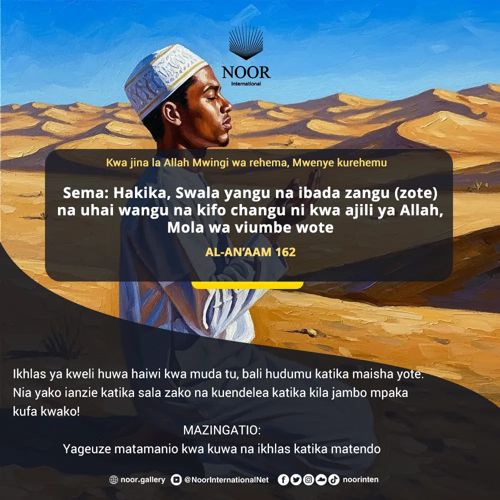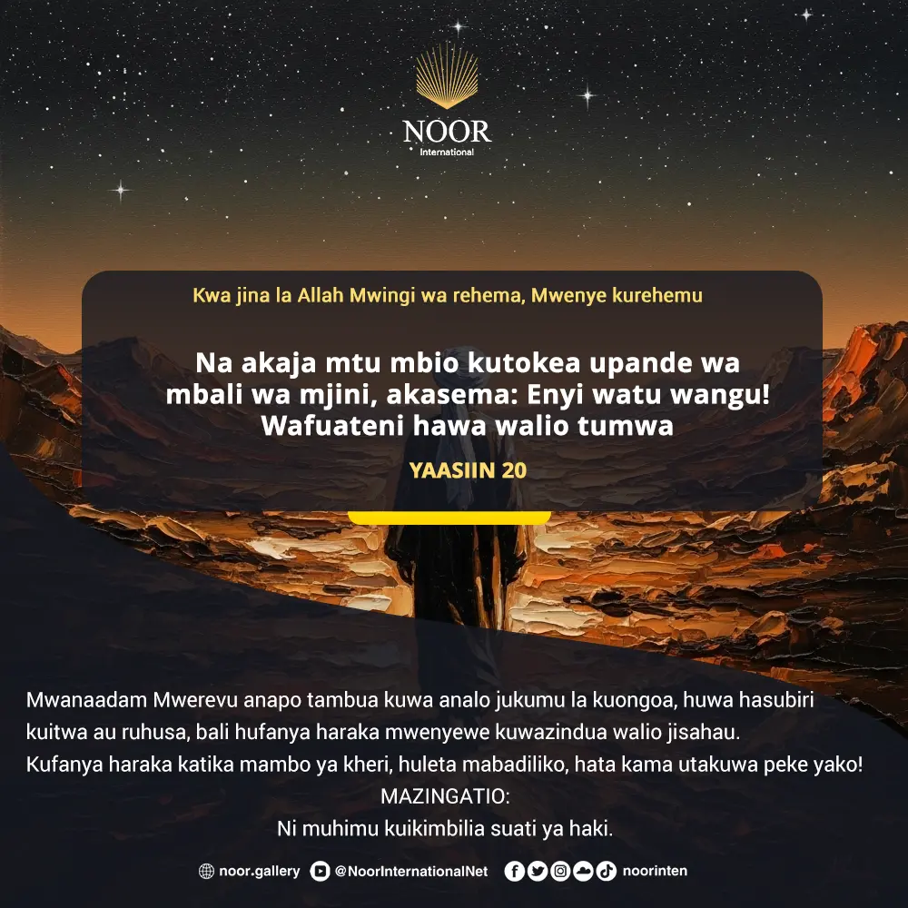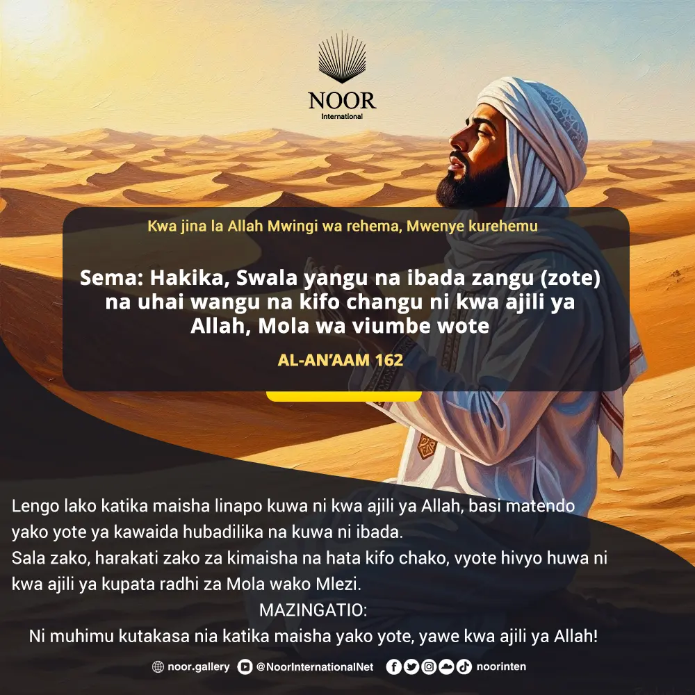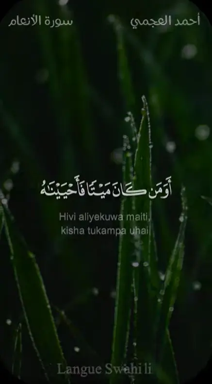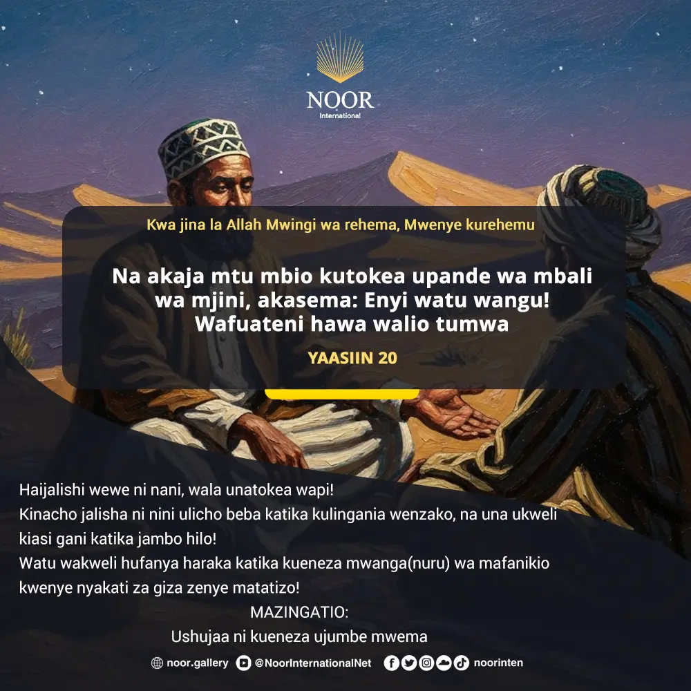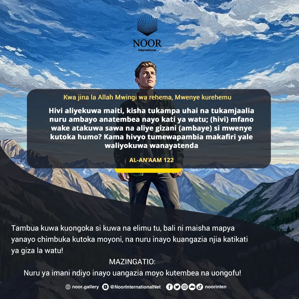 “Je, alie kuwa maiti kisha tukamhuisha, na tukamjaalia nuru inakwenda naye mbele za watu, mfano wake ni kama aliyoko gizani akawa hata hawezi kutoka humo? Kama hivyo makafiri wamepambiwa waliyo kuwa wakiyafanya”. Surat Al-An’aam: 122.
