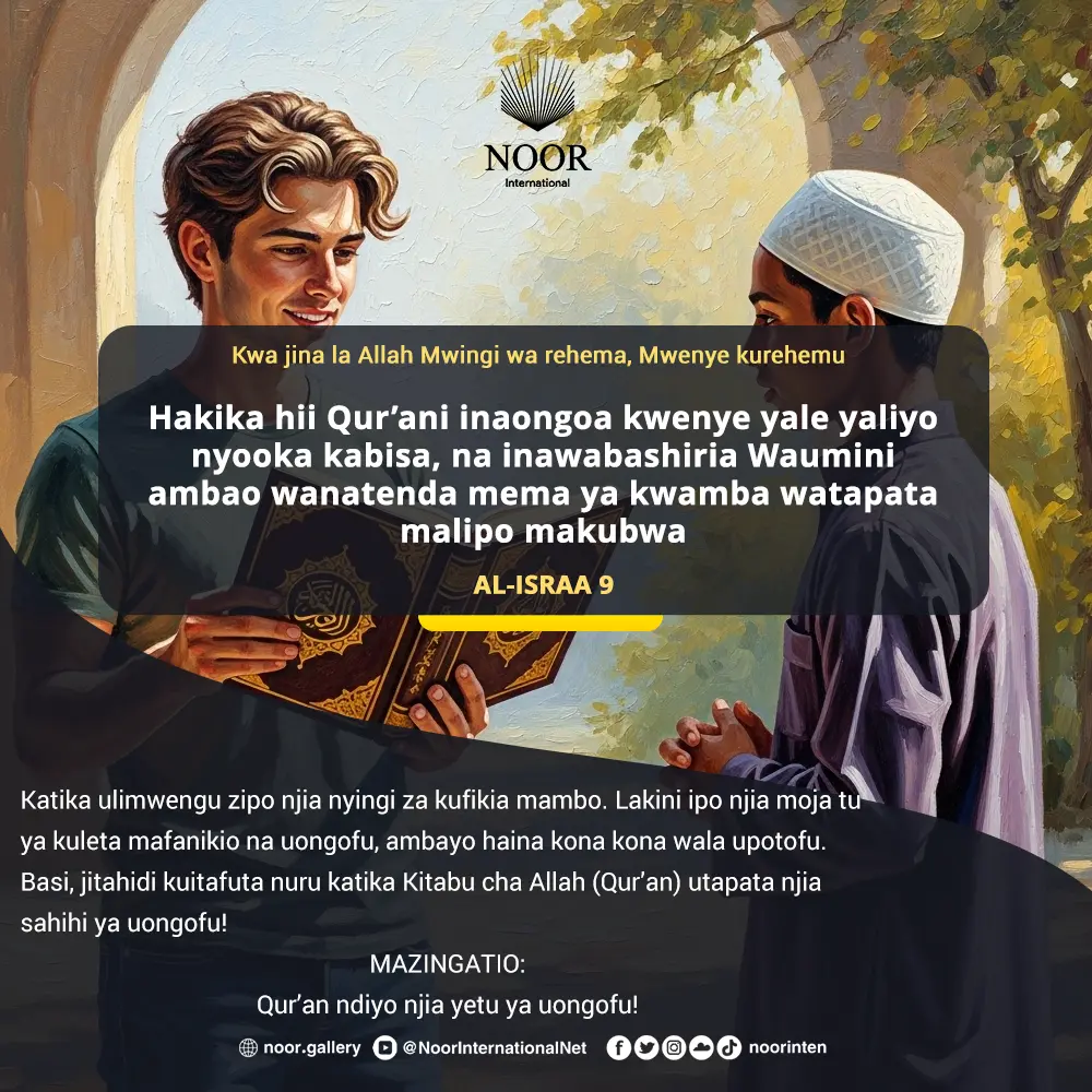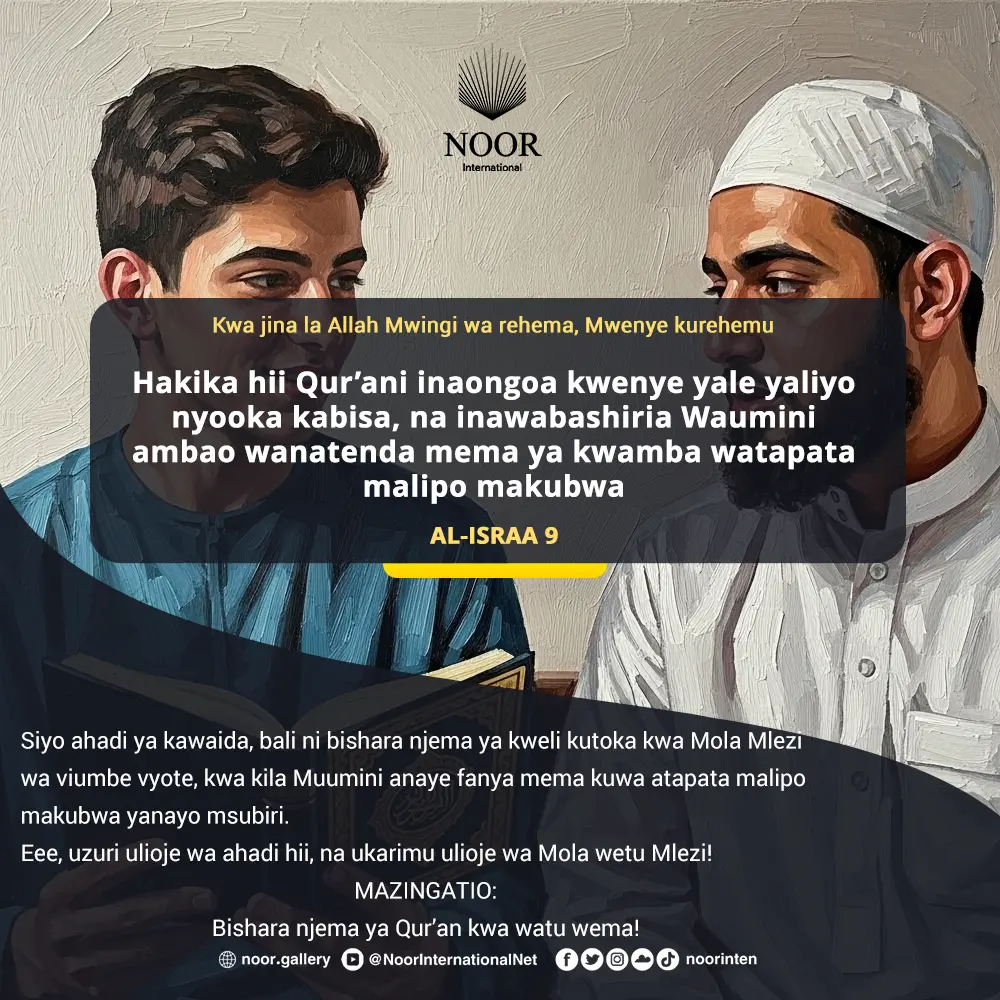 “Hakika hii Qur’an inaongoa kwenye yaliyo nyooka kabisa, na inawabashiria Waumini ambao wanatenda mema ya kwamba watapata malipo makubwa”. Surat Al-Israa: 9.