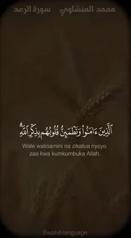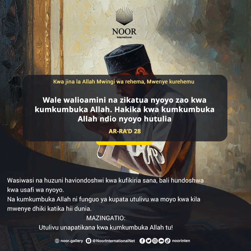 Wale walio amini na zikatulia nyoyo zao kwa kumkumbuka Allah. Hakika kwa kumkumbuka Allah ndiyo nyoyo hutulia!