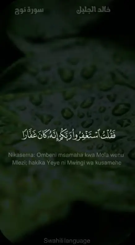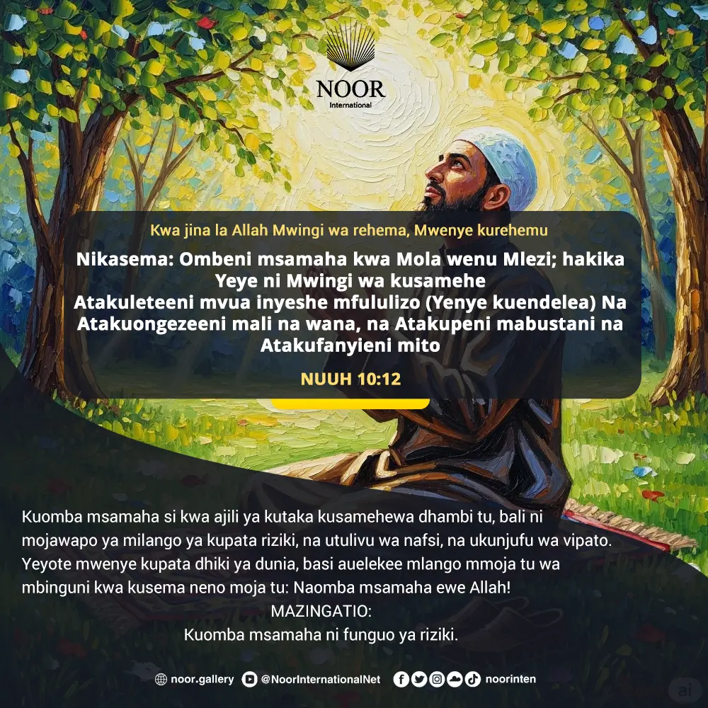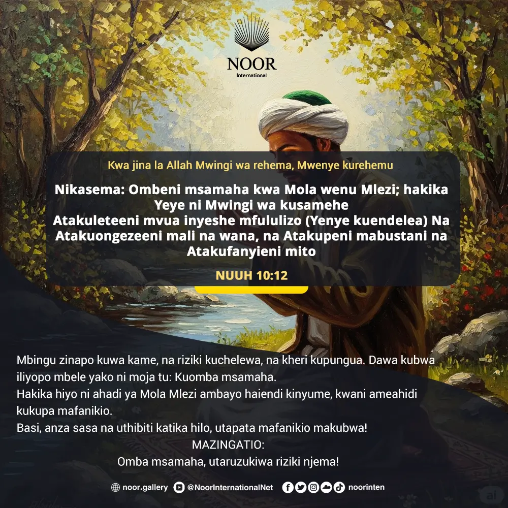 “Nikasema: Ombeni msamaha kwa Mola wenu Mlezi, hakika Yeye ni Mwingi wa kusamehe. Atakuleteeni mvua inyeshe mfululizo.Na atakupeni mali na watoto, na atakupeni mabustani na atakufanyieni mito”. Surat Nuh: 10-12.