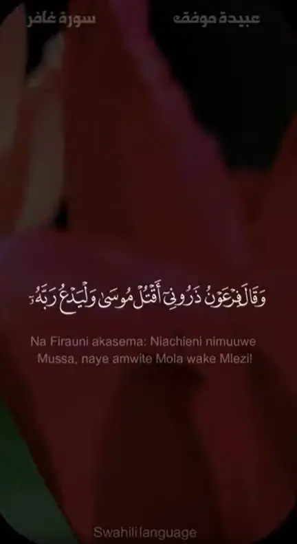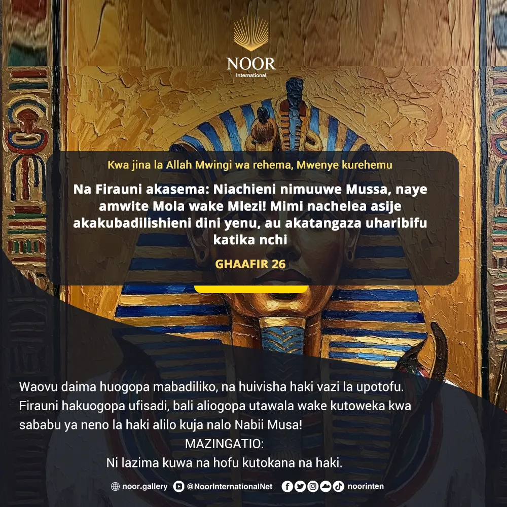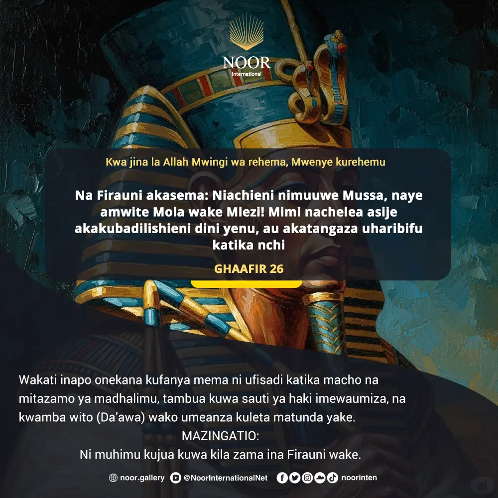 “Na Firauni akasema: Niachieni nimuuwe Musa, naye amwite Mola wake Mlezi! Mimi nachelea asije kukubadilishieni dini yenu, au akatangaza uharibifu katika nchi”. Surat Ghafir: 26.