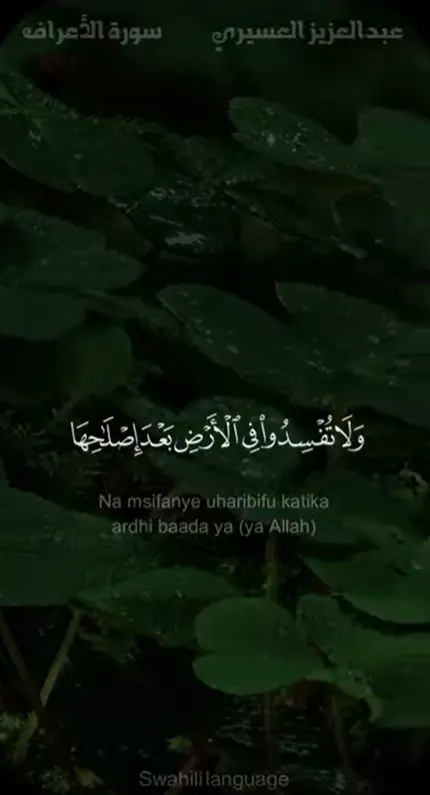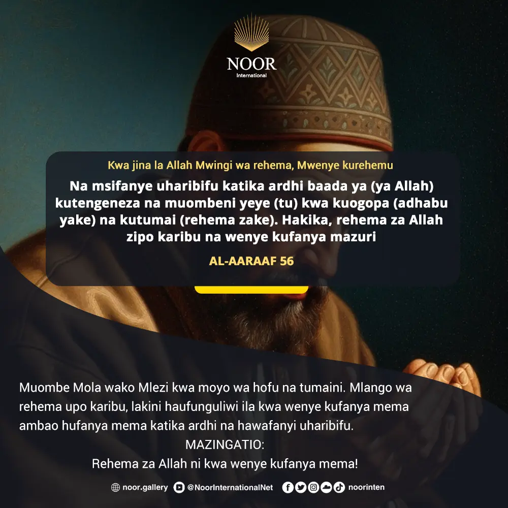 “Wala msifanye uharibifu katika nchi baada ya kuwa imekwisha tengenezwa. Na muombeni Yeye kwa kuogopa na kwa kutumai. Hakika rehema ya Allah iko karibu na wanao fanya mema”. Surat Al-A’araf: 56.