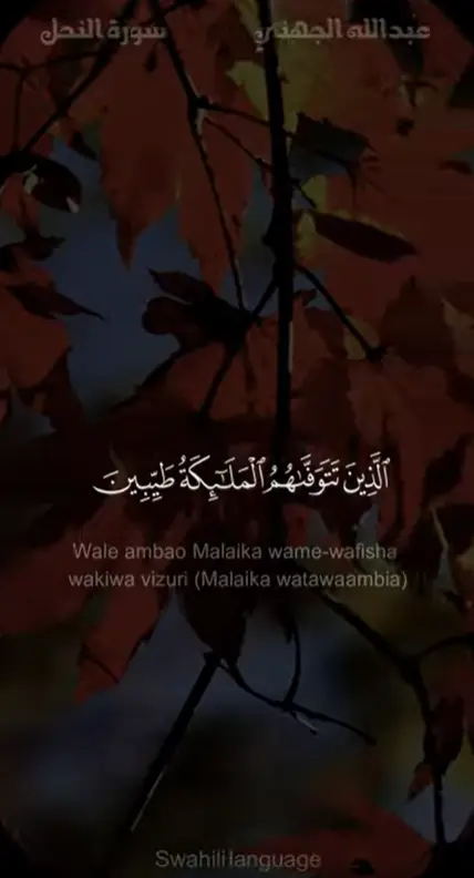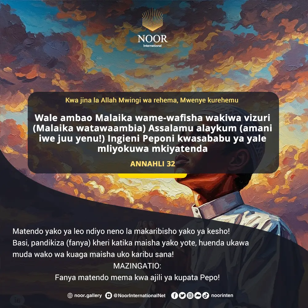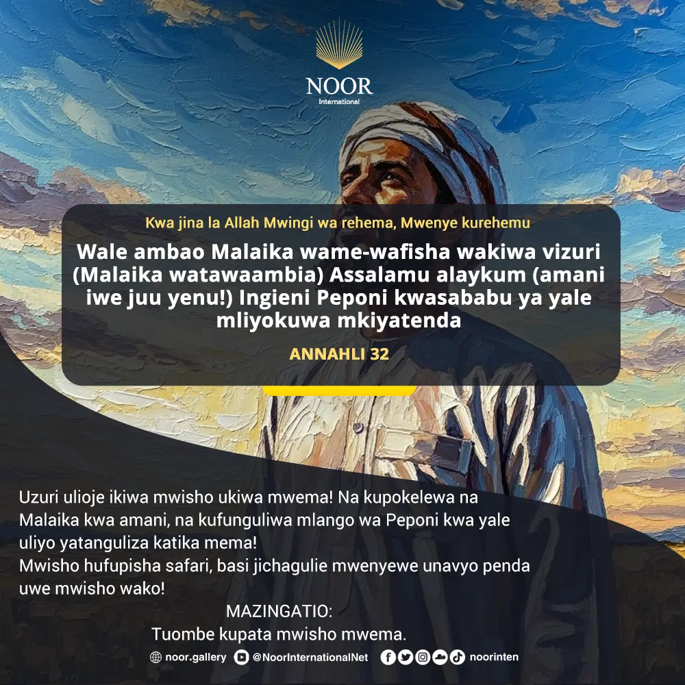“Wale ambao Malaika huwafisha katika hali njema, wanawaambia: Amani iwe juu yenu! Ingieni Peponi kwa sababu ya yale mliyo kuwa mkiyatenda”. Surat An-Nahl: 32.