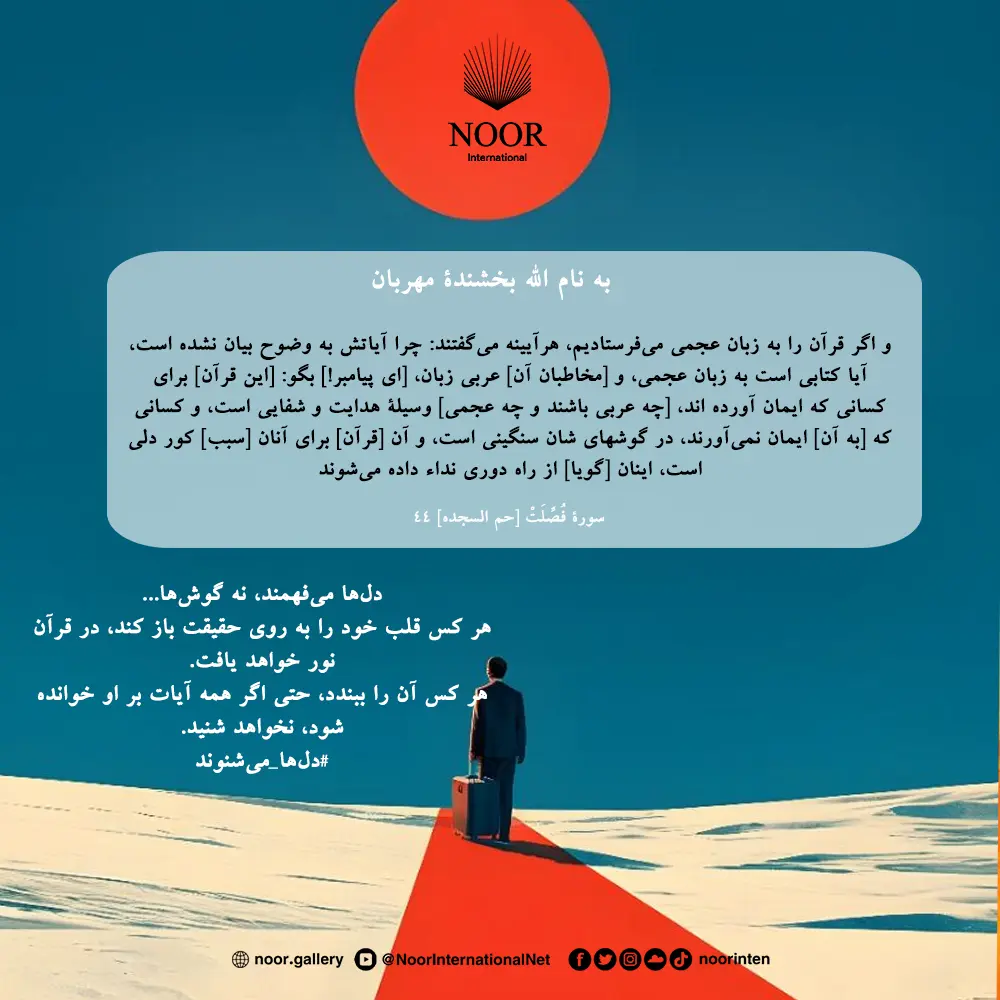 و اگر آن را قرآنی عجمی قرار میدادیم، میگفتند: «چرا آیاتش به روشنی بیان نشده است؟» [قرآنی] عجمی و عربی است. بگو: «این [قرآن] برای کسانی که ایمان آوردهاند، هدایت و شفا است. و کسانی که ایمان نمیآورند، در گوشهایشان سنگینی [قرآن] بر آنهاست. آنان از جایی دور ندا داده میشوند.»ٖ [فصّلت: 44]
