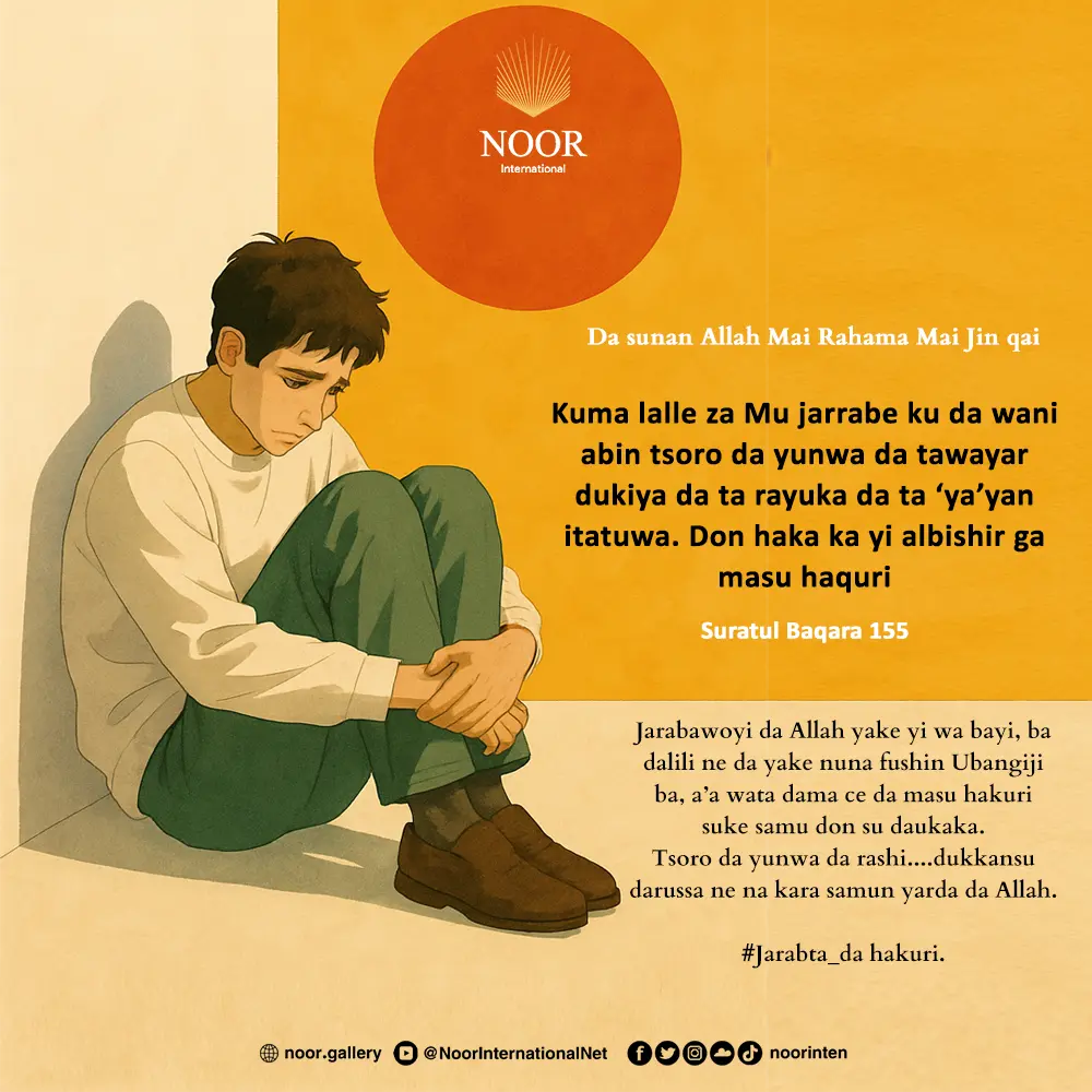 Kuma lalle za Mu jarrabe ku da wani abin tsoro da yunwa da tawayar dukiya da ta rayuka da ta 'ya'yan itatuwa. Don haka ka yi albirshir ga masu haquri.” [Bakara: 155]