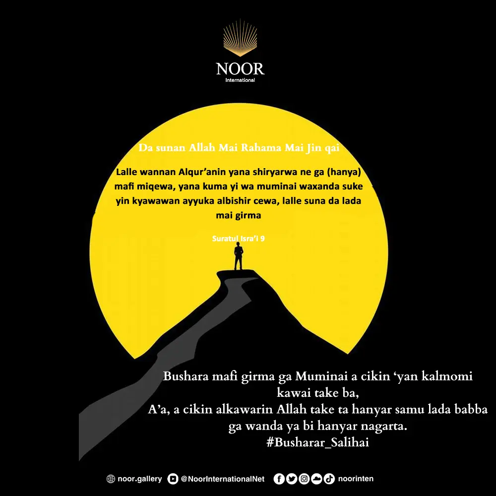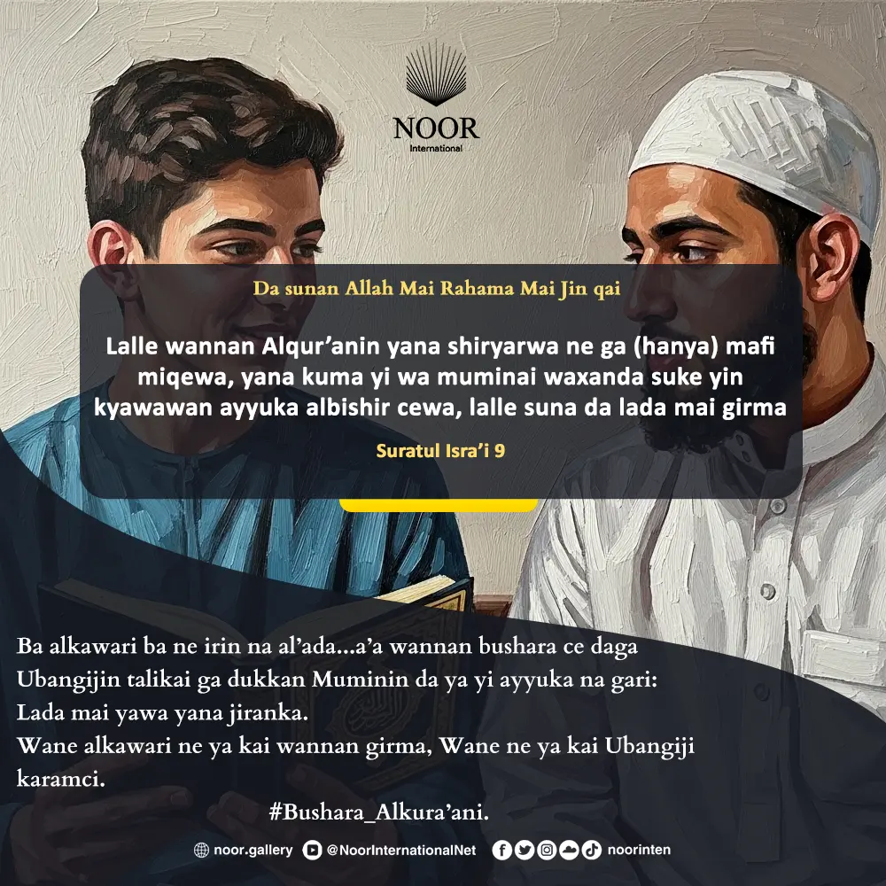 “Lalle wannan Alqur’anin yana shiryarwa ne ga (hanya) mafi miqewa, yana kuma yi wa muminai waxanda suke yin kyawawan ayyuka albishir cewa, lalle suna da lada mai girma.” [Isra’: 9]