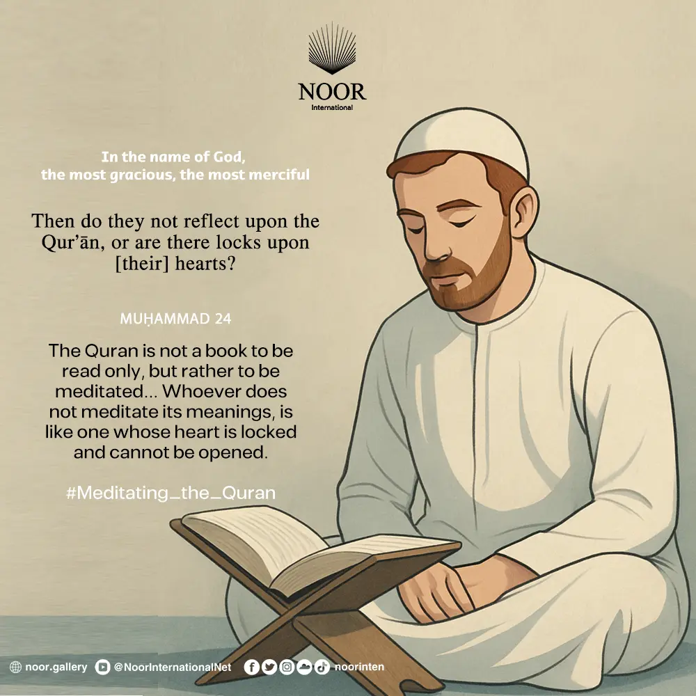 The Quran is not a book to be read only, but rather to be meditated... Whoever does not meditate its meanings, is like one whose heart is locked and cannot be opened.