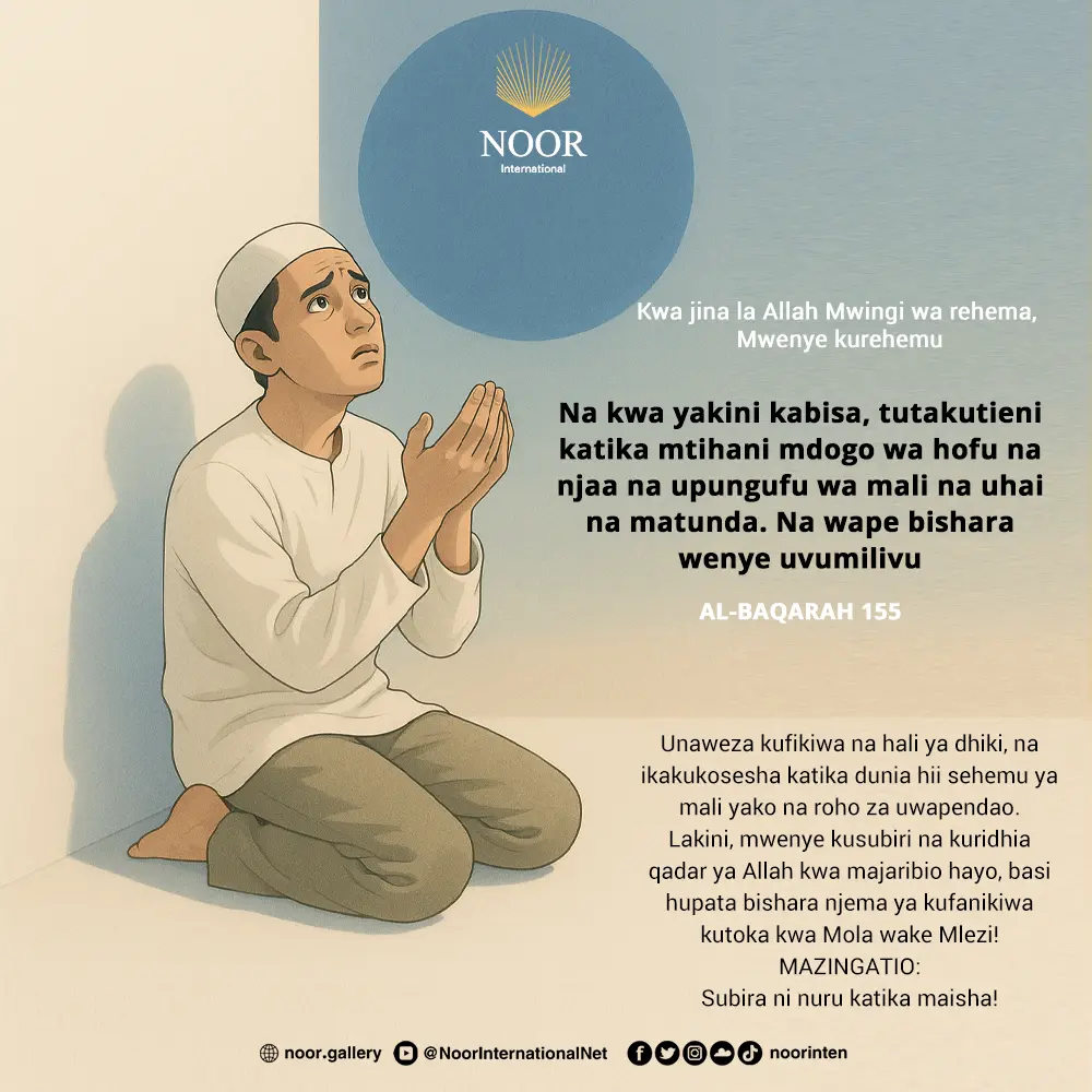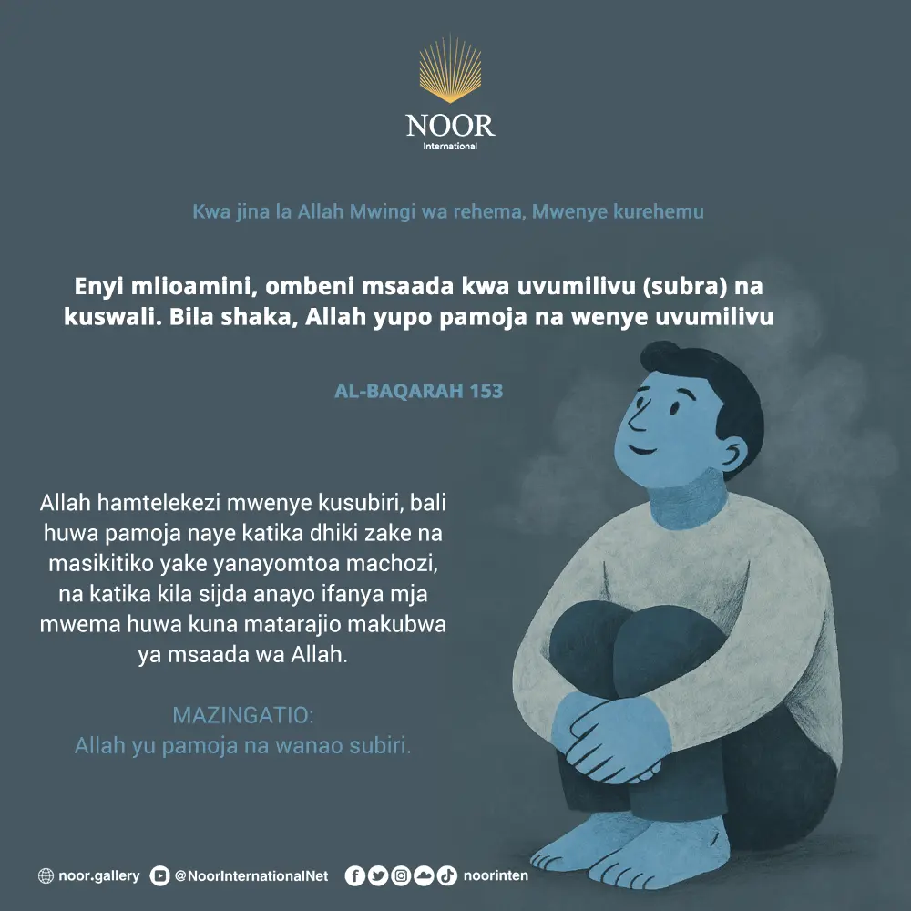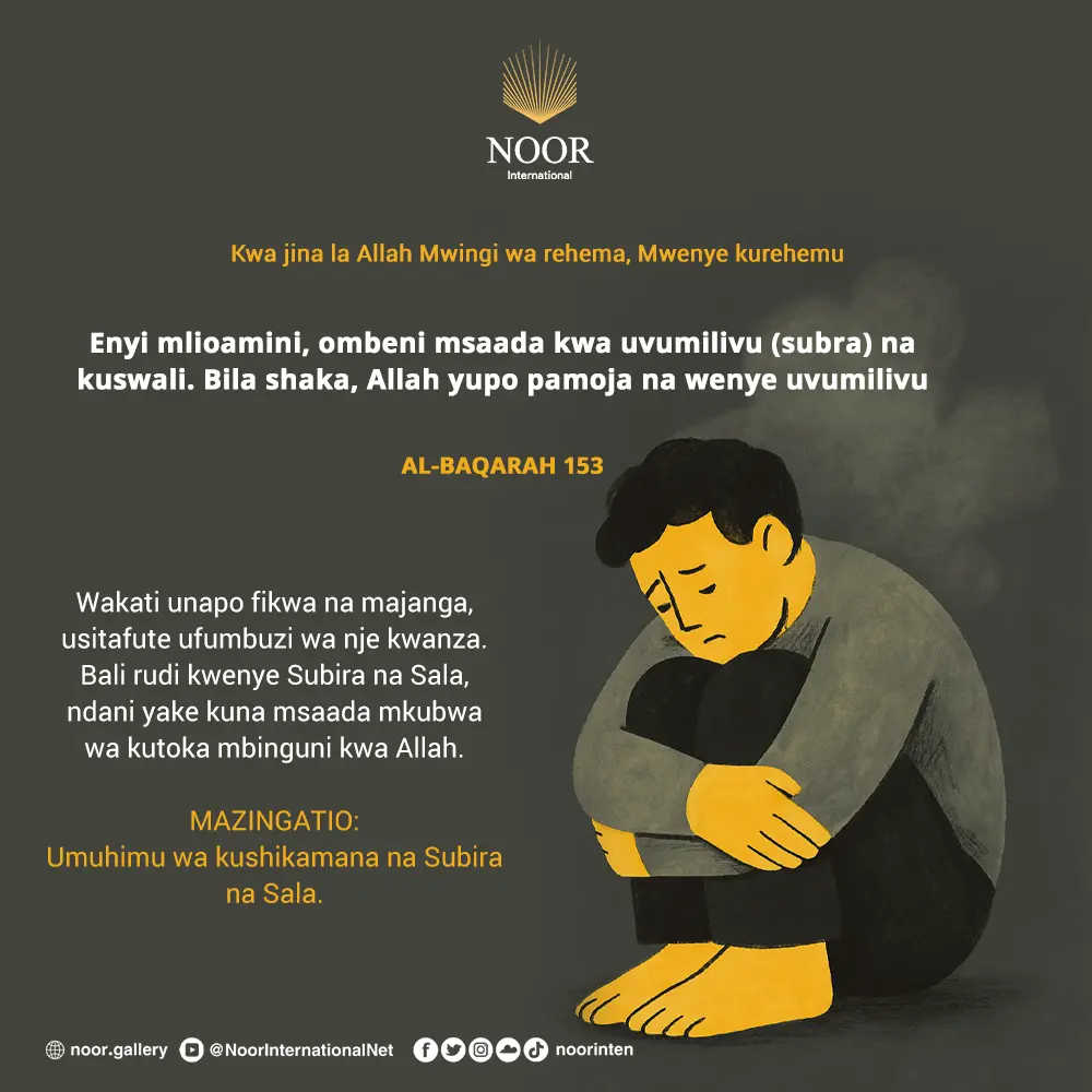 “Enyi mlio amini! Takeni msaada kwa kusubiri na Sala. Hakika Allah yu pamoja na wanao subiri”. Surat Al-Baqara: 153.