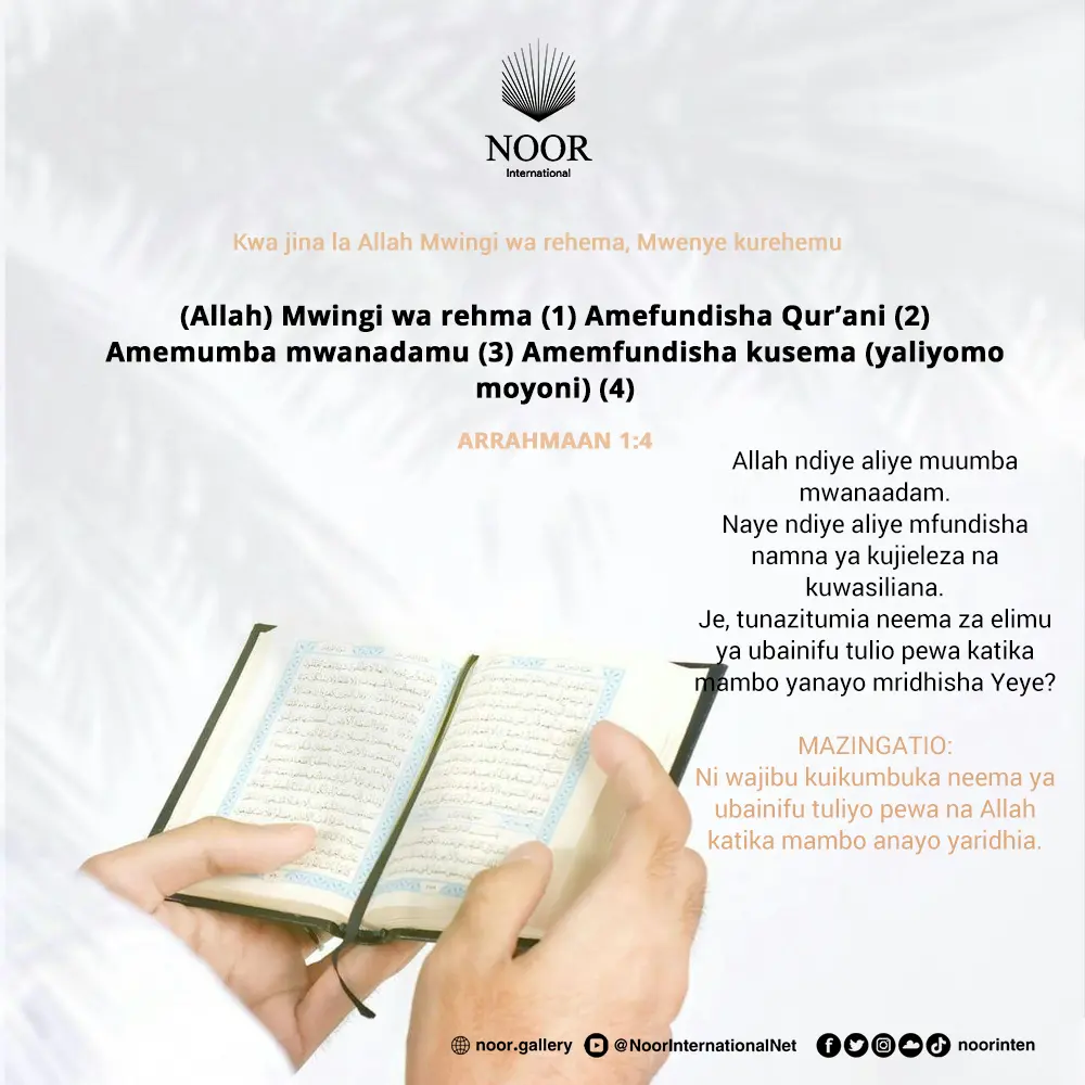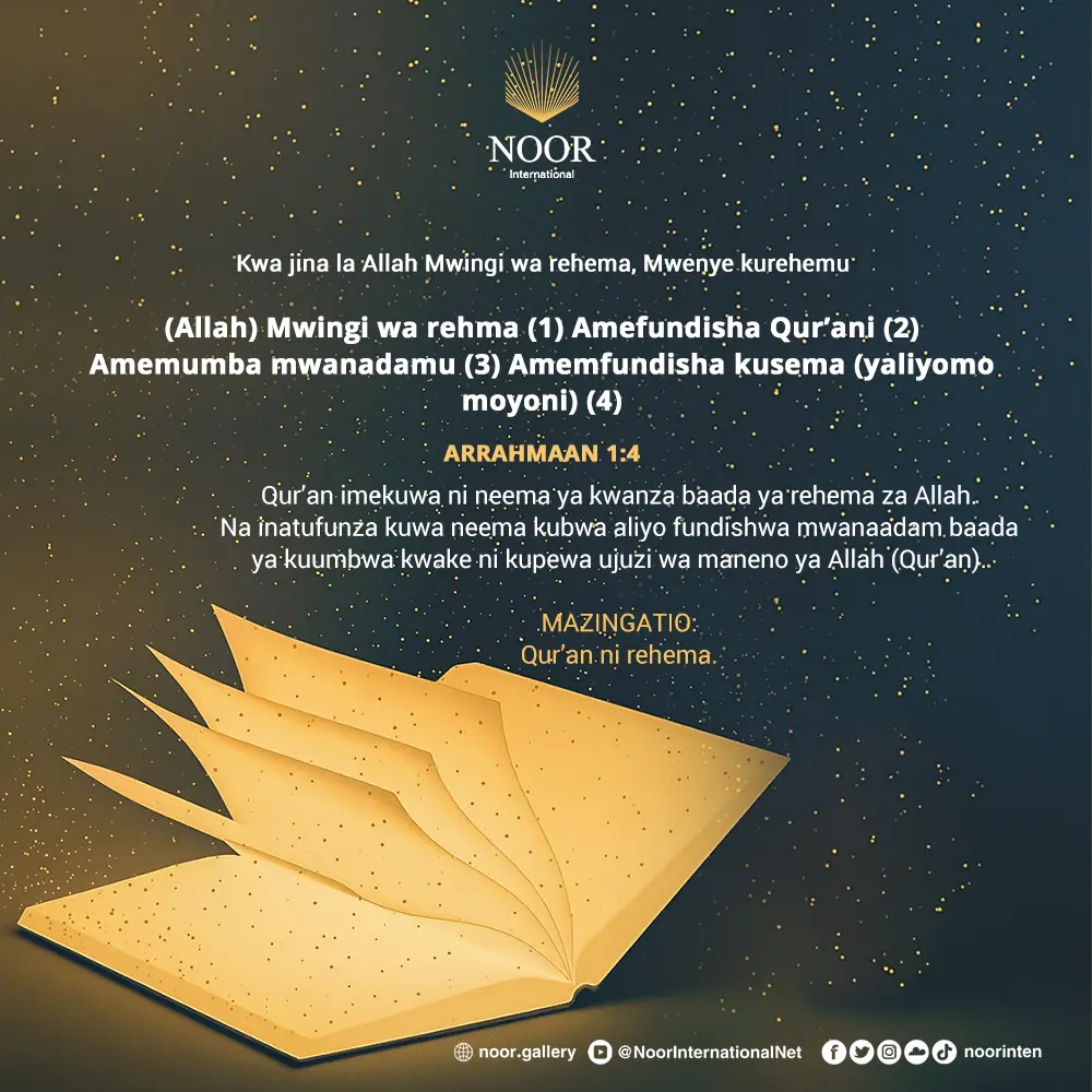 “Arrahman, Mwingi wa rehema. Amefundisha Qur’an. Amemuumba mwanaadam. Akamfundisha kubaini”. Surat Ar-Rahman: 1 – 4.