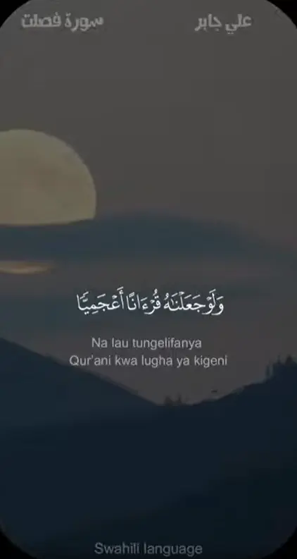 “Na lau tungeli ifanya Qur’an kwa lugha ya kigeni wangeli sema: kwa nini Aya zake hazikupambanuliwa? Yawaje lugha ya kigeni na Mtume Mwarabu? Sema: Hii Qur’an ni uwongofu na poza kwa wenye kuamini. Na wasio amini umo uziwi katika masikio yao, nayo kwao imezibwa hawaioni. Hao wanaitwa nao wako pahala mbali”. Surat Fusswilat: 44.