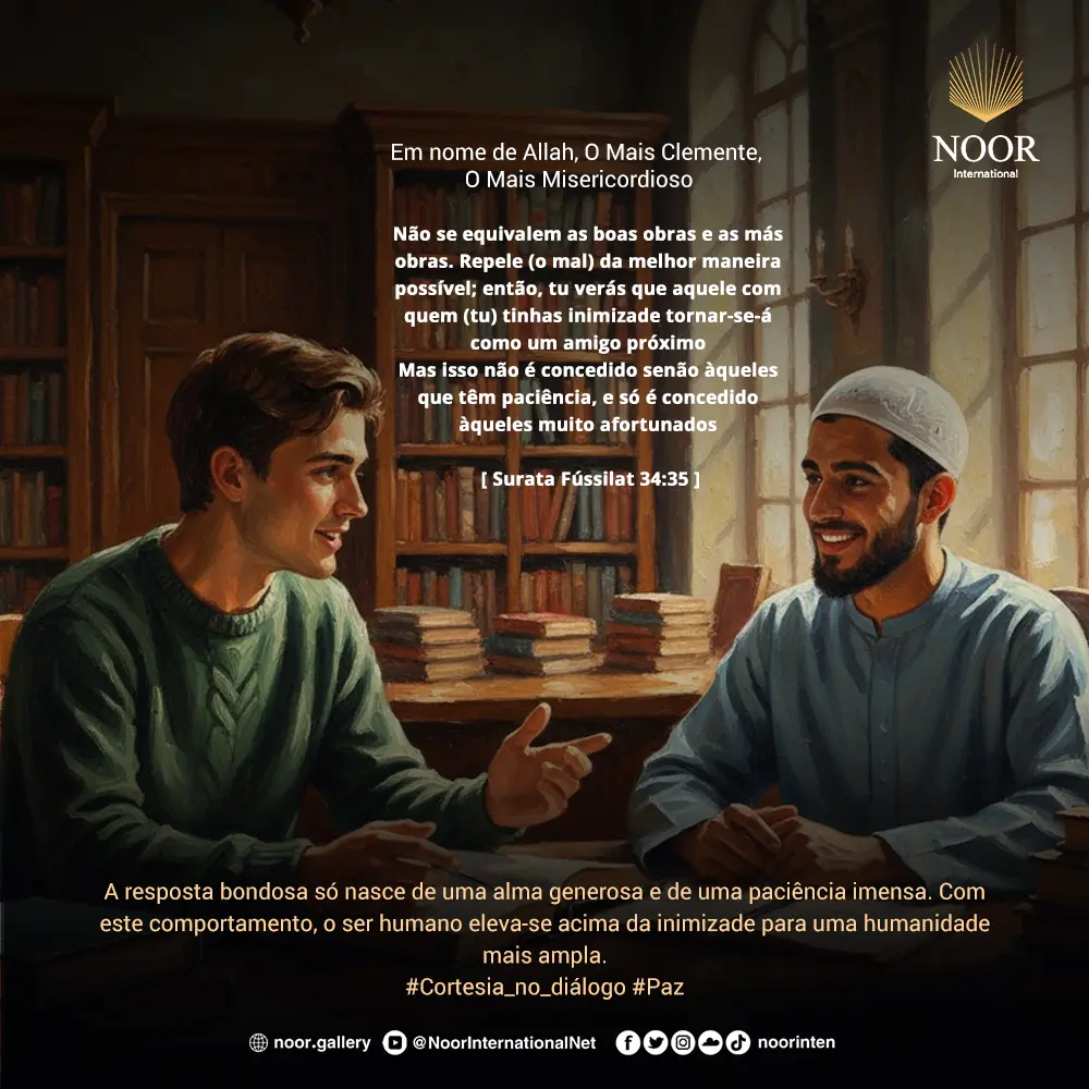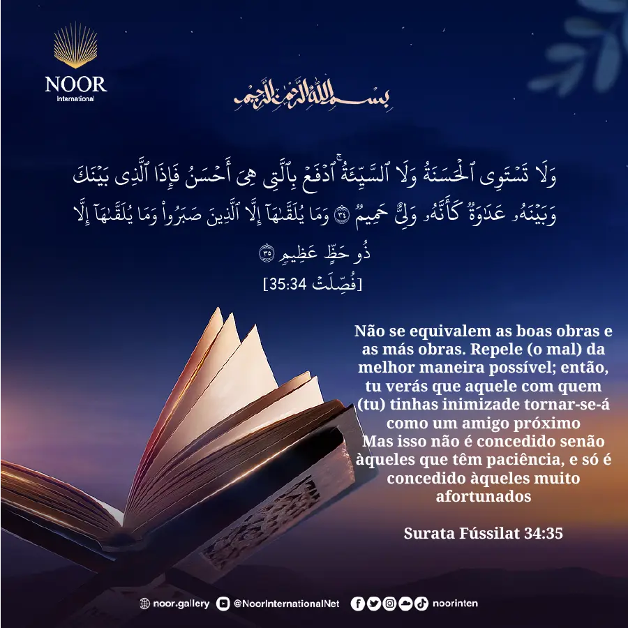 {Não se equivalem as boas obras e as más obras. Repele (o mal) da melhor maneira possível; então, tu verás que aquele com quem (tu) tinhas inimizade tornar-se-á como um amigo próximo. Mas isso não é concedido senão àqueles que têm paciência, e só é concedido àqueles muito afortunados.} [Corão 41:34-35]