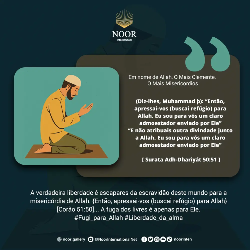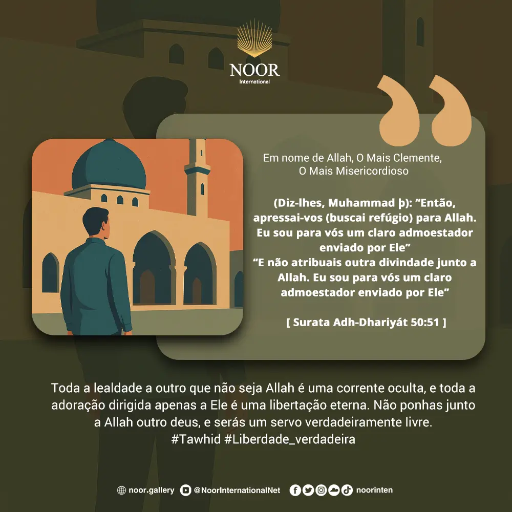 {(Diz-lhes, Muhammad): “Então, apressai-vos (buscai refúgio) para Allah. Eu sou para vós um claro admoestador enviado por Ele”. “E não atribuais outra divindade junto a Allah. Eu sou para vós um claro admoestador enviado por Ele”} [Corão 51:50-51]