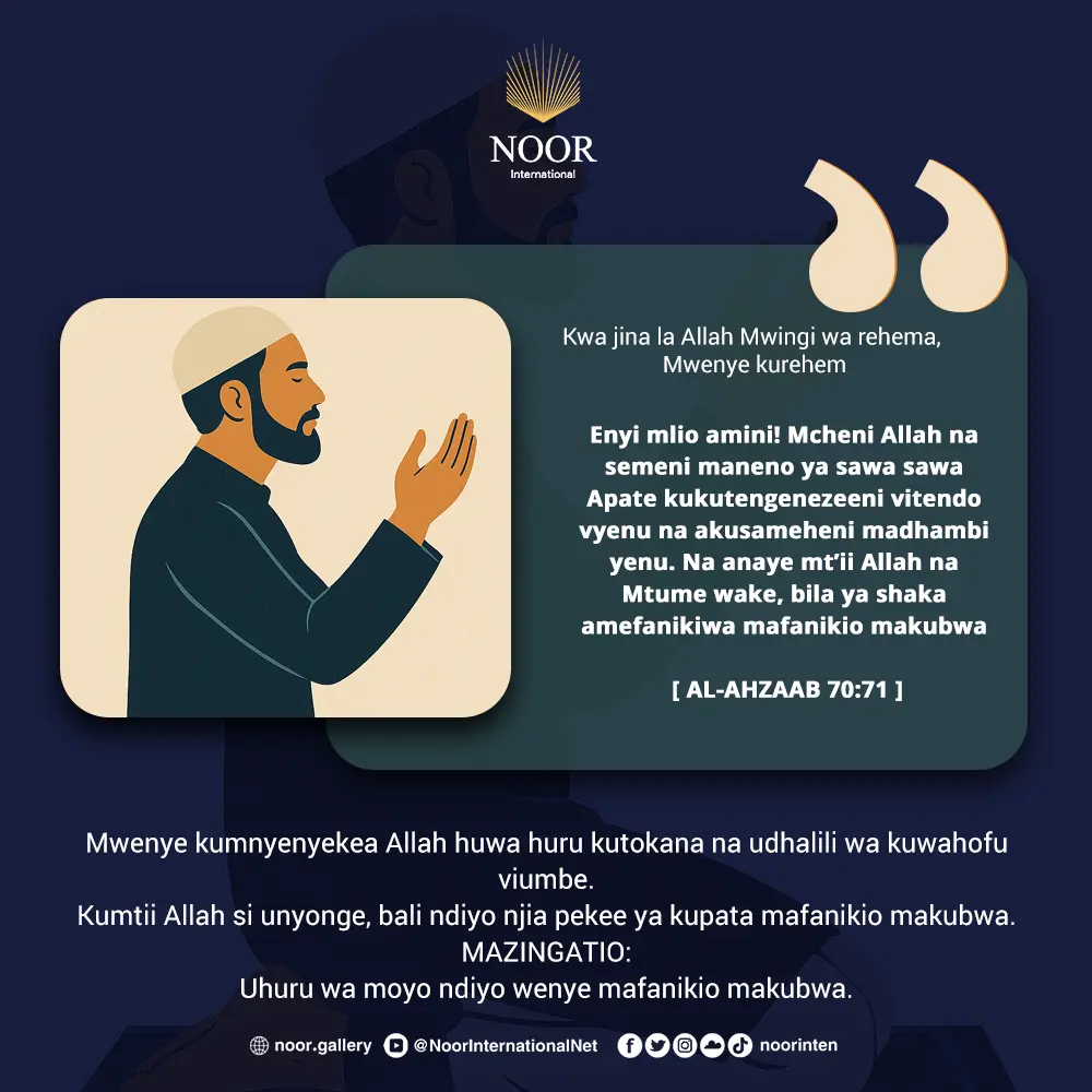 Kujisalimisha maisha yako kwa ajili ya Allah kwa kutii ndiyo uhalisia wa uhuru, kwa sababu wewe mwenyewe utakuwa umechagua njia ya amani.