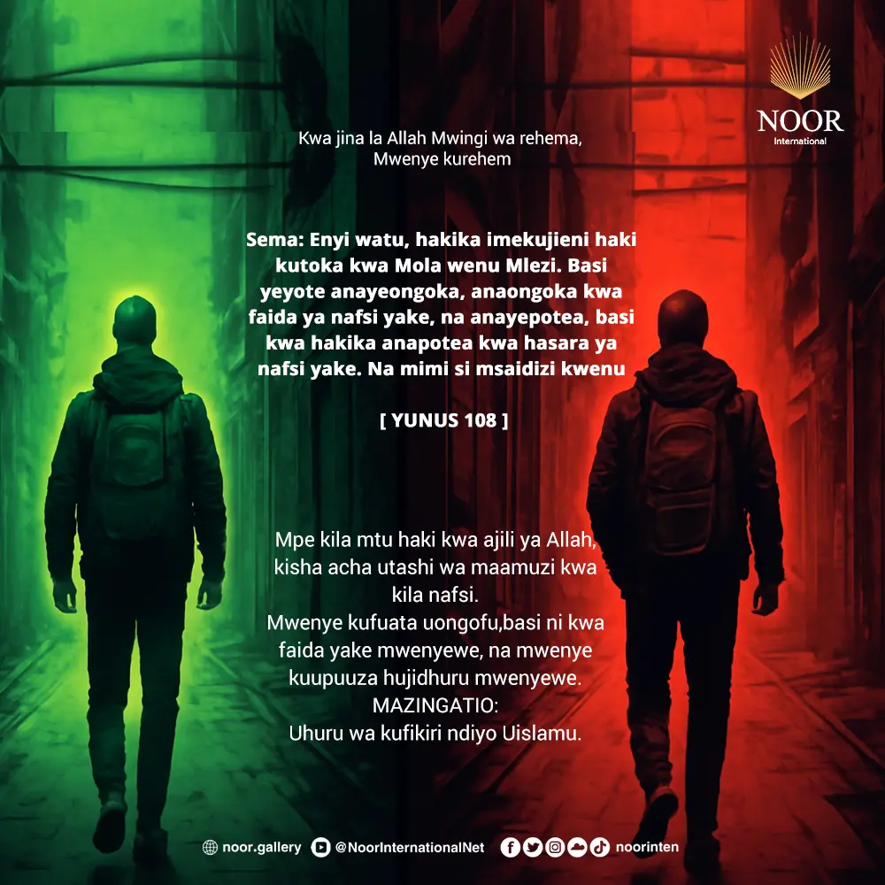 Mwenye kufuata uongofu,basi ni kwa faida yake mwenyewe, na mwenye kuupuuza hujidhuru mwenyewe.